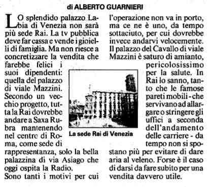 Interessante articolo di Alberto Guarnieri su Il Messaggero di oggi.Si da notizia che la Rai ha venduto la sede di Venezia e che il progetto di dismissione degli immobili non ha solo fini organizzativi o di risanamento delle casse di Viale Mazzini. No, c’è altro…Il fatto è che a viale Mazzini c’è l’amianto.