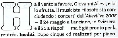 Se vi capitasse di leggere che Giovanni Allevi darà (ormai lo ha dato, il 24 maggio) un concerto a Lanciano (CH), dove lo localizzereste? In Abruzzo o in Svizzera? Come ha segnalato Alfonso Fuggetta, nel numero di maggio di una rivista (che potete sfogliare anche online qui, vedere pagina 27) c’è questa pregevole chicca:
