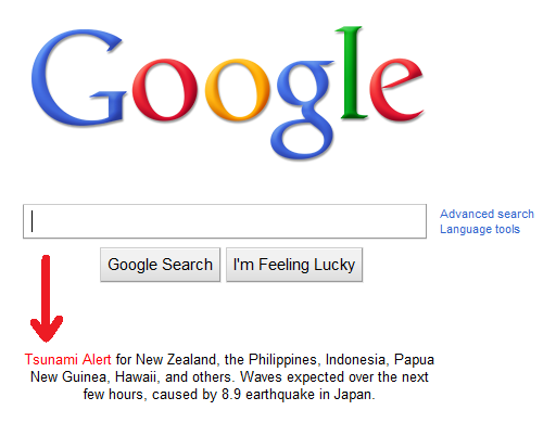 L’essenzialità della homepage di google.com permette alle poche righe dedicate al terremoto in Giappone e all’allarme tsunami nel Pacifico di calamitare l’attenzione degli utenti.