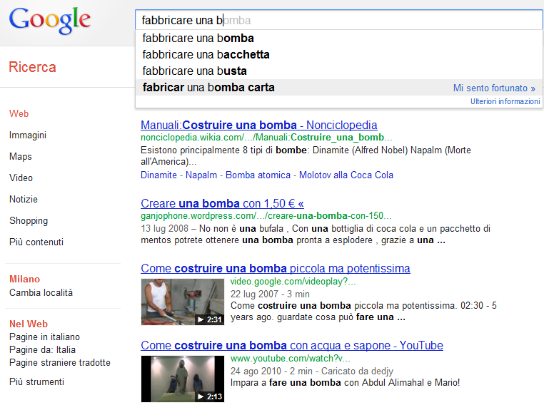 Google e gli altri motori di ricerca svolgono, sostanzialmente, una funzione di bacheca, di vetrina di contenuti altrui, ma l’aspetto forse più paradossale di queste vicende è che i provvedimenti dei tribunali che li considerano (impropriamente) hosting provider li obbligano a comportarsi come tali, poiché impongono una funzione di controllo e di editing che normalmente i motori di ricerca non attuano. Google lo fa automaticamente solo su termini legati alla pornografia o a questioni di buon costume, e non importa se poi non esistano filtri su ricerche di altro genere, che sarebbero decisamente da evitare, come questa: