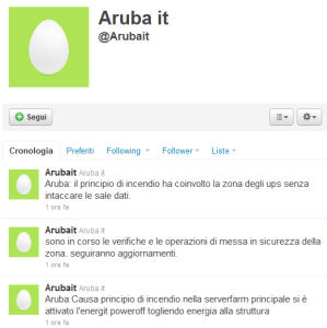 La piccola catastrofe ha spinto l’azienda ad aprire un canale su Twitter (no, una delle più grandi webaziende italiane non l’aveva prima di un’ora fa): chi volesse informazioni aggiornate le può trovare su http://twitter.com/#!/Arubait