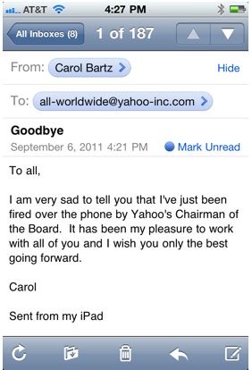 Carol Bartz non è più CEO di Yahoo!, il presidente Timothy Morse l’ha chiamata al telefono per licenziarla e lei si congeda dai colleghi via mail.