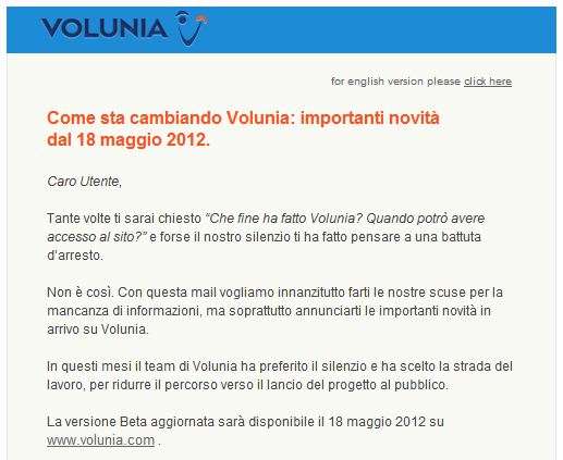 In tutta sincerità devo dire che la domanda “Che fine ha fatto?”, una volta me la sono posta, ma poi Volunia è rimasto lì, chiuso in uno dei miei tanti cassetti della memoria. , che si è riaperto stamattina, con una mail (che rappresenta anche il post inaugurale di blog.volunia.com) con cui il Team Volunia chiede scusa per il silenzio di questi mesi e annuncia imminenti e importanti novità:
