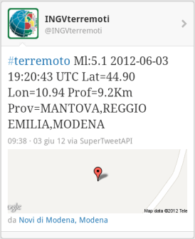 Negli ultimi giorni, con il terremoto che ha colpito (e continua a colpire) la pianura padana e in particolare l’Emilia, emerge con molta energia anche l’informazione veicolata da Internet, soprattutto attraverso Twitter, i cui utenti danno aggiornamenti attraverso brevi messaggi. Anche l’INGV – il cui Centro Nazionale Terremoti ha un proprio sito web e recentemente ha aperto anche un blog – utilizza questo canale per comunicare, nel più breve tempo possibile, intensità e coordinate degli eventi che si verificano sul territorio.