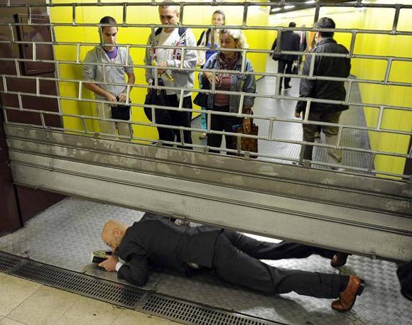 Il signore che vedete non è incastrato, si sta rovinando l’abito perché sta passando sotto una serranda abbassata dal personale dell’ATM in sciopero. Perché i treni ci sono e lui vuole prenderne uno…