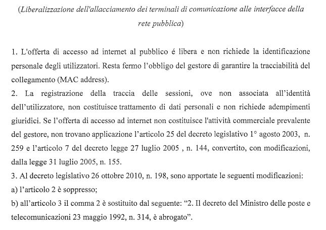 L’offerta di accesso ad internet al pubblico è libera e non richiede la identificazione personale degli utilizzatori. Resta fermo l’obbligo del gestore di garantire la tracciabilità del collegamento (MAC address)
