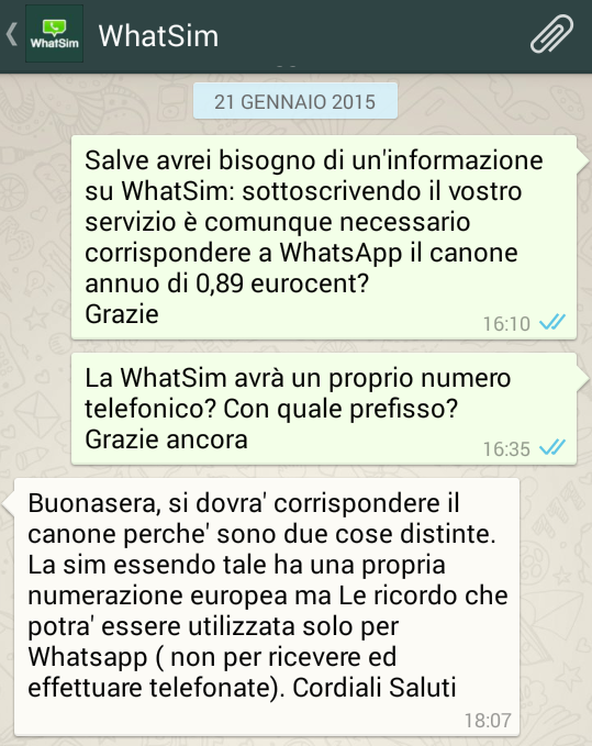 Nemmeno WhatsApp può essere definito un servizio gratuito, nonostante sia irrisorio un canone annuo di 0,89 euro. Naturalmente non lo è nemmeno WhatSim, dal momento che richiede la ricarica di un canone annuo di 10 euro, corrispondente a 2mila crediti. E non include il canone annuo di 0,89 euro, da pagare a WhatsApp (chiarimento datomi dallo staff WhatSim, riscontrabile nella chat riprodotta qui a destra).