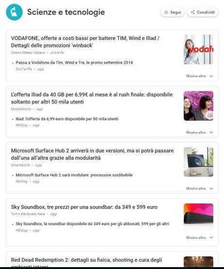 Ma quanto è deprimente vedere un aggregatore di notizie – quale si definisce Google News – privilegiare offerte commerciali nella sezione “Scienze e tecnologie”. Certo, sono informazioni relative all’utilizzo di dispositivi tecnologici, ma nello specifico si parla di opzioni e piani tariffari per il traffico telefonico voce e dati e, più in generale,dell’evoluzione del mercato dei servizi offerti dalle compagnie telefoniche: la correlazione tra mercato ed evoluzione tecnologica non è sicuramente un aspetto trascurabile, ma vedere ogni giorno – nella pagina simboleggiata dal microscopio – novità tariffarie e videogiochi che “scavalcano” argomenti scientifici e tecnologici mi fa pensare che forse è il momento di chiamare le cose con il loro nome.