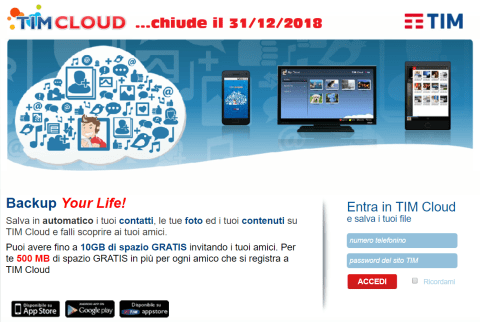 Attivo dal 2011 per i clienti privati TIM, il servizio TIM Cloud sta per chiudere i battenti. Ad annunciarne tristemente la prematura scomparsa – prevista per il 31 dicembre 2018 – è la sezione Comunicazioni e News del sito istituzionale, con una nota dal tono secco e seccante: