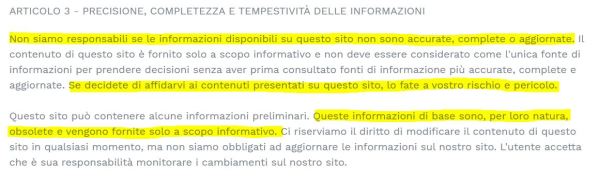 Non siamo responsabili se le informazioni disponibili su questo sito non sono accurate, complete o aggiornate. Il contenuto di questo sito è fornito solo a scopo informativo e non deve essere considerato come l’unica fonte di informazioni per prendere decisioni senza aver prima consultato fonti di informazione più accurate, complete e aggiornate. Se decidete di affidarvi ai contenuti presentati su questi sito, lo fate a vostro rischio è pericolo.