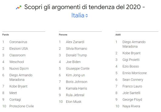 Uno dei giochi che mi piace fare quando Google pubblica le sue classifiche delle ricerche svolte nell’anno che volge al termine è confrontare i risultati italiani con quelli globali. Rende l’idea su ciò che gli utenti del nostro Paese hanno messo a fuoco rispetto al resto del mondo. Ci sono analogie e differenze importanti, che rispecchiano la nostra realtà socio-culturale. Nella Top 5 assoluta delle “nostre” ricerche troviamo Coronavirus, Classroom, Weschool e Nuovo Dpcm: termini che in un anno non caratterizzato dall’emergenza sanitaria difficilmente avrebbero guadagnato posizioni così elevate. Sono però contento per Weschool, piattaforma didattica digitale made in Italy che è riuscita a porsi quale alternativa alle soluzioni proposte educational di Microsoft e Google.