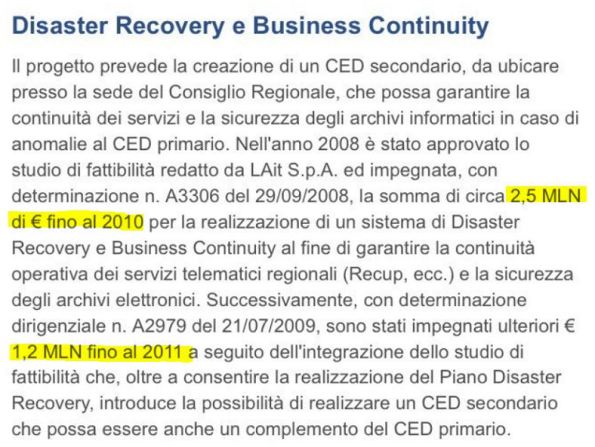 Certo, è auspicabile che siano state adeguate le tecnologie utilizzate nella realizzazione del piano di disaster recovery di qualche anno fa. Ne riporto un estratto nell’immagine, onde evitare che la fonte istituzionale non renda più disponibili queste informazioni, che includono anche l’ammontare di denaro pubblico investito a suo tempo: