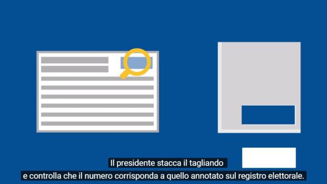 L’elettore consegna al presidente la scheda chiusa e la matita. Il presidente constata la chiusura della scheda e, ove questa non sia chiusa, invita l’elettore a chiuderla, facendolo rientrare in cabina; ne verifica l’identita’ esaminando la firma e il bollo, e confrontando il numero scritto sull’appendice con quello scritto sulla lista; ne distacca l’appendice seguendo la linea tratteggiata, stacca il tagliando antifrode dalla scheda, controlla che il numero progressivo sia lo stesso annotato prima della consegna e, successivamente, pone la scheda senza tagliando nell’urna.