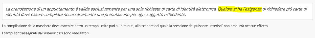 Qualora si ha l’esigenza di richiedere più carte di identità deve essere compilata necessariamente una prenotazione per ogni soggetto richiedente.