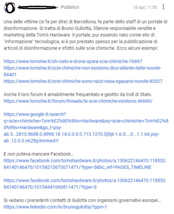 Non inserirò link e nomi che potrebbero aumentare la visibilità online di questi mentecatti, ma mi limiterò a riportarvi un esempio delle loro corbellerie, partendo da un “campione” che già ebbe modo di esprimersi in modo analogo contro una vittima italiana dell’attacco al Bataclan a Parigi (la cui famiglia ha poi deciso di procedere legalmente, mi auguro vinca l’azione legale):
