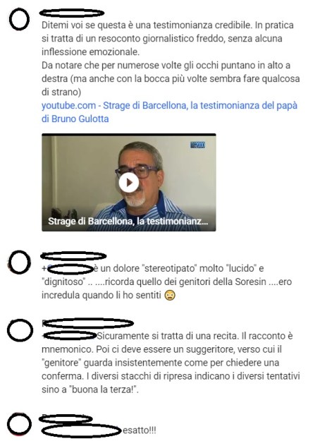 Personalmente mi limito a constatare che chi si permette di parlare di persone e argomenti che non conosce, formulando ipotesi fuori dal mondo, oltraggiose nei confronti delle vittime di attacchi terroristici e dei loro familiari, nuoce gravemente alla salute mentale di coloro che, per limiti o ignoranza, potrebbero dare loro credito. Non si tratta di persone che vedono al di là del proprio naso, ma di personaggi che non si rendono conto nemmeno di ciò che è banalmente evidente al di qua del loro naso. Si vantano di essere “vaccinate” contro la disinformazione dei media, ma in realtà si tratta di esaltati che negano l’evidenza e perdono il proprio tempo, nel senso più genuino del termine, ossia che stanno disperdendo il tempo della propria vita in dannose attività di disinformazione, taluni in malafede e altri, loro seguaci, nella cieca convinzione (?) di far aprire gli occhi al prossimo, avendo però chiuso i propri (e senza voler dar ascolto ad altre ragioni, puerilmente).