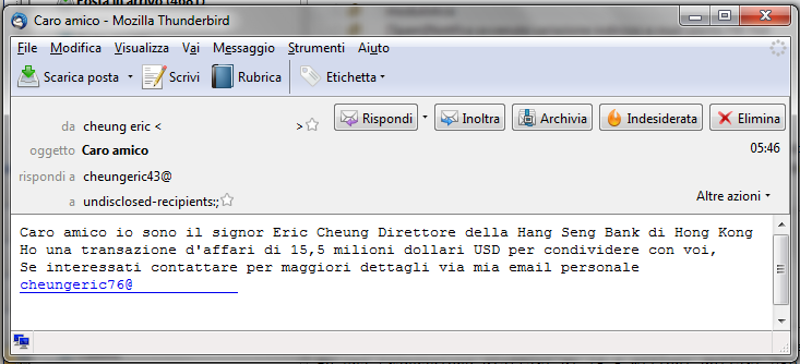 Sorprese della vita? No, piuttosto direi che le truffe alla nigeriana, nel frattempo diffuse in altri Paesi del mondo, stanno cambiando registro e affinando la tecnica: un tempo mirate solo ad ingolosire il destinatario della mail con un’inaspettata “eredità” di milioni e milioni di dollari, ora fanno leva sulla sensibilità e sullo spirito caritatevole di chi riceve il messaggio. Certamente l’avvocato, una volta contattato, si premurerà di fornire ogni informazione utile a completare la transazione, concordando innanzitutto le modalità con cui gli dovrà essere corrisposta una certa somma, a titolo di copertura di spese bancarie, di apertura pratica, o di chissà cos’altro.