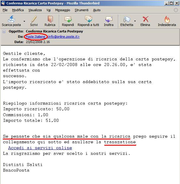 A parte il fatto che si tratta della classica traduzione automatica (che sarebbe inutile, se il mittente fosse effettivamente Poste Italiane), anche Thunderbird – il mio client di posta elettronica – nutre fondati sospetti che il messaggio in questione “possa essere un tentativo di frode”. Ma per tutti quei messaggi che possono generare dubbi nell’utente, ricordo una cosa fondamentale: un istituto bancario, una compagnia di assicurazion, Poste Italiane o altre organizzazioni non chiederebbero mai all’utente una conferma dei dati personali attraverso un link in una mail.