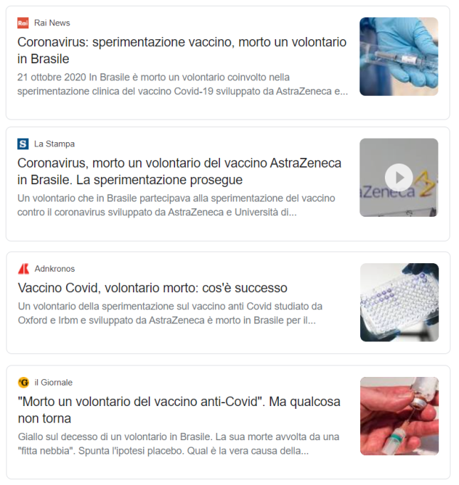 Qui non c’è da essere no-vax o pro-vax, c’è da fare informazione. Quelli riportati qui sono esempi eclatanti di come non si fa: i titoli di queste notizie inducono senza troppa difficoltà a pensare che un volontario brasiliano sia rimasto vittima della sperimentazione del vaccino anti-Covid. Approfondendo la lettura degli articoli, si scopre invece che si tratta di una persona che si era iscritta per la sperimentazione, ma non aveva ancora ricevuto la dose (bensì un placebo): g1.globo.com, fra le prime fonti della notizia, riferisce che la vittima è deceduta per complicazioni da Covid-19, contratto da medico impegnatosi in prima linea nella guerra contro questa malattia. Il caso verrà comunque studiato, ma il risultato richiederà tempo. Per cui in questo momento la vera notizia, dunque, è che un altro medico ha perso la vita in questa emergenza in cui, assurdamente, c’è ancora chi preferisce ricamarci sopra, ancor prima di sapere come sono andate le cose.