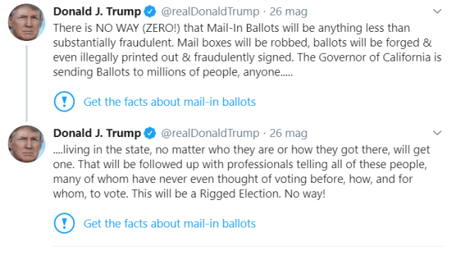 Il messaggio riguarda l’attendibilità dei Mail-In Ballots, cioè i voti per corrispondenza: Trump li reputa non veritieri perché la posta potrebbe essere rubata o falsificata, e perché il Governatore della California (un Democratico) spedisce schede elettorali a milioni di persone, senza curarsi di chi siano, e alle quali saranno date istruzioni su come e a chi dare il proprio voto. In calce ai tweet, Twitter ha collocato un dicitura in blu, ben evidente, con un punto esclamativo – che richiama l’attenzione del lettore – seguito dalla frase “Get the facts about mail-in ballots”, ossia “scopri i fatti sulle votazioni per corrispondenza”.