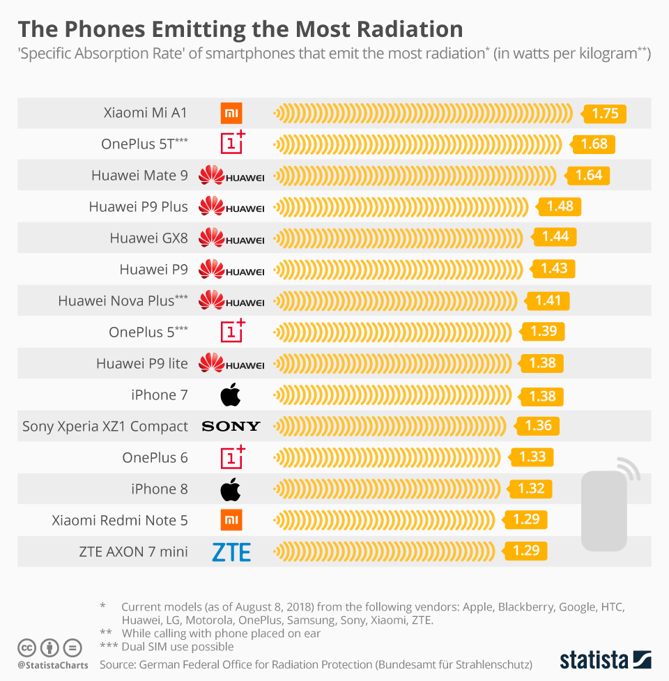 La scorsa settimana il portale tedesco Statista ha pubblicato la classifica aggiornata dei 15 smartphone con il SAR più elevato (in termini di valori rilevati quando il dispositivo viene portato all’orecchio) in cui svettano Xiaomi, OnePlus, Huawei ed Apple: