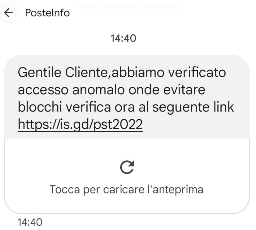 Eventualmente dovremmo leggere “un” accesso anomalo (lo so, potrebbe sembrare irrilevante, ma gli SMS provenienti da Poste Italiane sono solitamente scritti in buon italiano). Ma c’è anche un link anonimo: