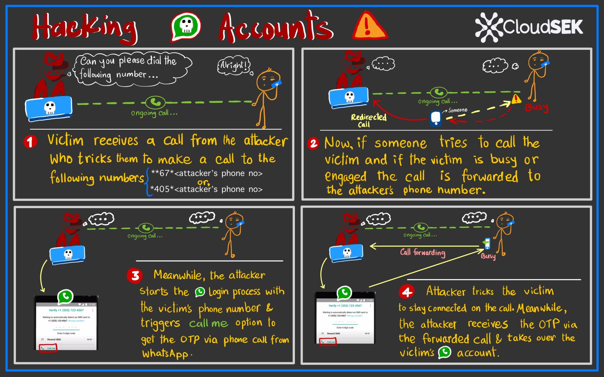 Acconsentire alla richiesta di un estraneo di impostare quel codice gli permetterà (in quanto malintenzionato) di ricevere tutte le vostre telefonate. Il malintenzionato a cui riesce questo giochino sarà così pronto allo step successivo: seguire la procedura di login a WhatsApp con il numero di telefono della vittima. Selezionando inoltre l’opzione “chiamami”, potrà ricevere il codice OTP tramite telefono o WhatsApp.