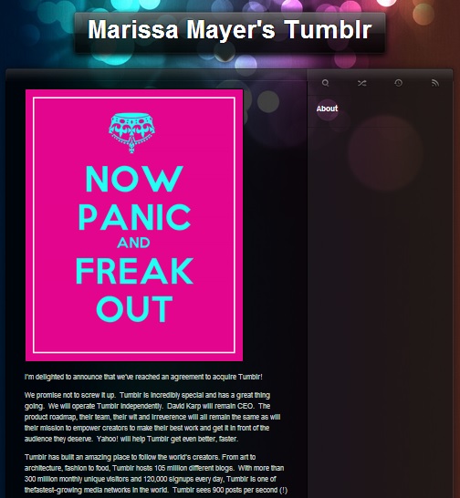 Marissa Mayer – ex manager di Google e oggi presidente e amministratore delegato di Yahoo, ha confermato le trattative rumoreggiate dalla stampa nei giorni scorsi, comunicando il raggiungimento dell’accordo per rilevare Tumblr (nota piattaforma di tumblelog, ossia di piccolo blog). Le parole poco formali con cui ha dichiarato ufficialmente l’operazione ne fanno il mio mito di oggi: