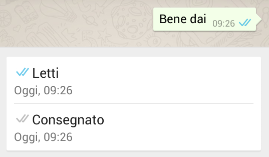 P.P.P.S: Mi è stato segnalato che è bene ricordare come il competitor Telegram abbia già da tempo la conferma di lettura. In effetti i suoi check hanno una finalità diversa: il primo significa “inviato al cloud Telegram con notifica al destinatario” (se consente le notifiche), mentre il secondo è “messaggio letto” (ossia il destinatario ha aperto Telegram e ha aperto anche la conversazione che contiene il messaggio). Manca un “recapitato al dispositivo del destinatario” (che in WhatsApp è il doppio check grigio). Il perché è presto spiegato: contrariamente a WhatsApp, Telegram può essere utilizzato dallo stesso utente su vari dispositivi, quindi una notifica di recapito non darebbe al mittente un’informazione significativa.
