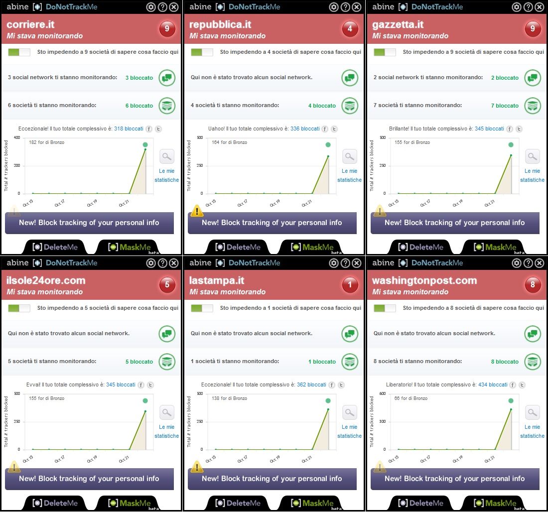 Con l’ausilio di un’estensione denominata DoNotTrackMe (disponibile per vari browser) potreste scoprire verità forse impensabili. Quello che segue è un esempio di quanto accade quando fate innocentemente visita al sito web di alcune fra le più popolari testate giornalistiche (doppio click per ingrandire l’immagine).