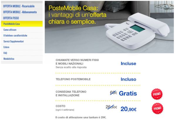 PosteMobile lancia il suo servizio di “telefonia fissa” basato su rete mobile: si chiama PosteMobile Casa e include chiamate a numeri nazionali (fissi e mobili) senza scatto alla risposta, servizio di segreteria telefonica, avviso di chiamata e apparecchio telefonico ad un canone fisso oggi di 20,90 euro da pagare mensilmente.