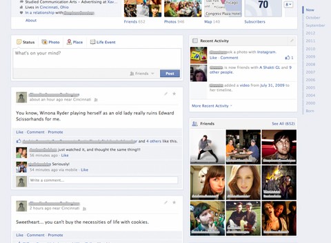 Ciò che si vede è un nuovo design a colonna singola, con una colonna a destra più stretta, per contenuti di supporto (numero amici, attività recenti, eccetera). Anche la testata del profilo è stata ridisegnata e – per ciò che si vede nelle immagini proposte – non sono più presenti i dati personali dell’utente. Eliminati anche i box attuali (Amici, Foto, Mappa, “Mi piace”), ai cui contenuti è stato riservato un pulsante. Certamente la nuova interfaccia conterrà altre novità meno evidenti… Piacerà? Non piacera? Ai posteri l’ardua sentenza.